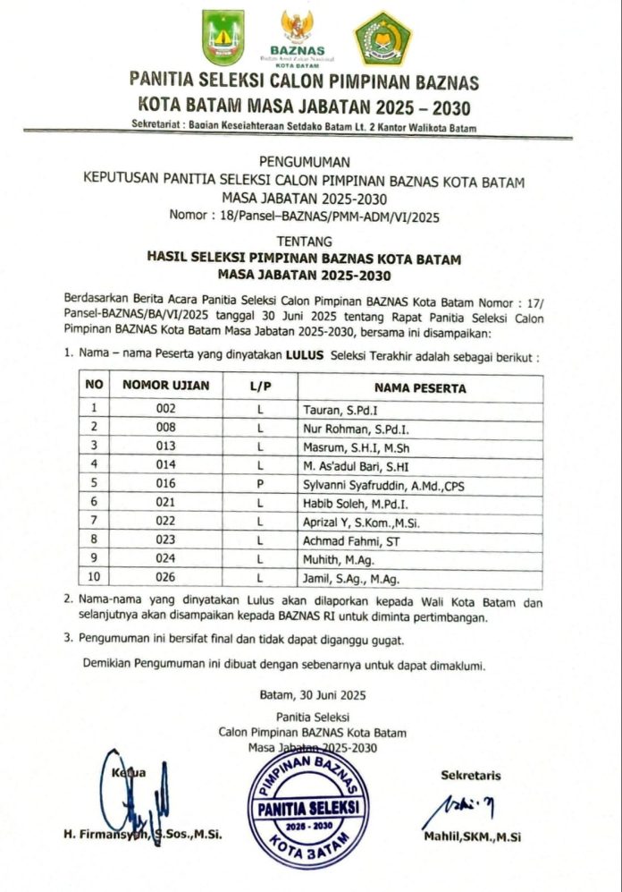 TERASBATAM.ID – Panitia Seleksi Calon Pimpinan Badan Amil Zakat Nasional (BAZNAS) Kota Batam telah mengumumkan 10 nama finalis yang lolos seleksi akhir untuk masa jabatan 2025-2030 pada 30 Juni 2025. Pengumuman ini menandai babak akhir seleksi yang sebelumnya diwarnai dengan kehadiran beragam latar belakang, termasuk politisi senior hingga mantan jurnalis kawakan.