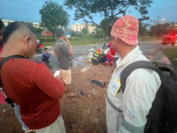 “Ada kawan dari pihak (pengendara motor) dia cium dari rusun sana, bawa api bawa asap. Dia kira motor dia (yang terbakar), padahal mobil itu,” ujar salah satu saksi mata dalam percakapan di lokasi kepada www.terasbatam.id.