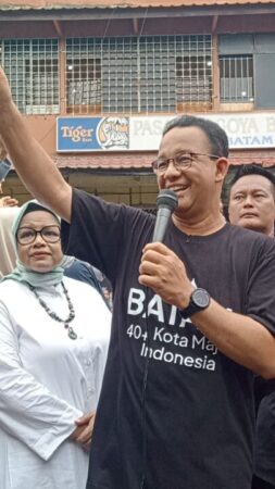 TERASBATAM.ID: Dengan menggunakan baju kaos berwarna hitam dengan tulisan “Batam 40+ Kota Maju Indonesia” Calon Presiden Nomor Urut 1 Anies Rasyid Baswedan meninjau pasar pagi Toss 3.000, Jumat (19/01/2024) pagi. Antusiasme warga Batam dinilai oleh mantan Gubernur DKI Jakarta itu cukup luar biasa menyambut perubahan yang ditawarkan dirinya.