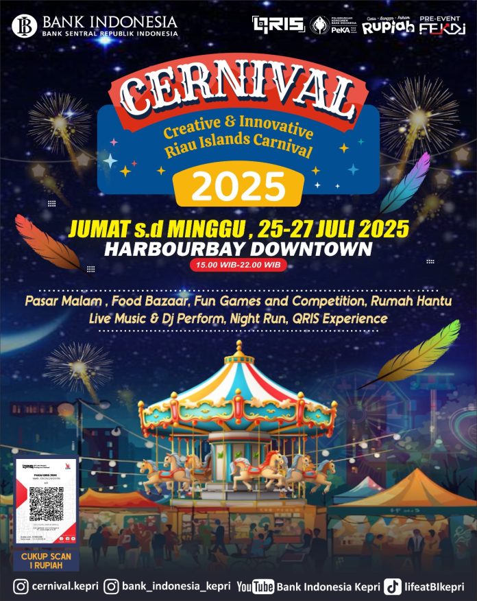 TERASBATAM.ID – Bank Indonesia Provinsi Kepulauan Riau (Kepri) siap menghelat CERNIVAL 2025 (Creative & Innovative Riau Islands Carnival) mulai Jumat hingga Minggu, 25-27 Juli 2025. Acara yang berlokasi di HarbourBay Downtown, Batam, ini akan berlangsung pukul 15.00-22.00 WIB, dengan tujuan utama mendorong digitalisasi sistem pembayaran dan inklusi keuangan di wilayah Kepri.