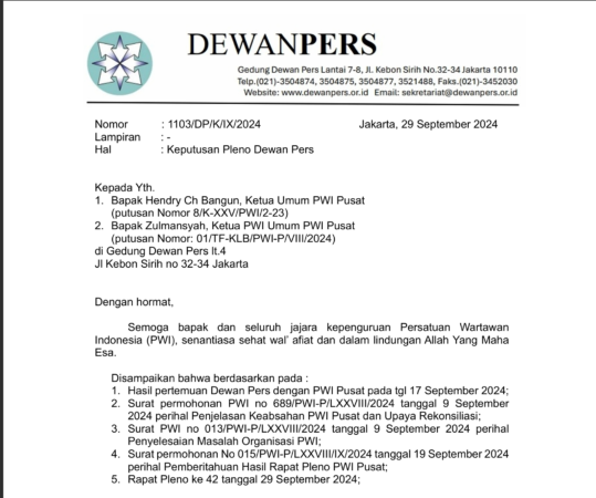 “Sampai dengan para pihak di PWI belum dapat menyelesaikan perselisihan internal dan melakukan penyelesaian maka izin penggunaan kantor PWI di Gedung Dewan Pers lt.4 Jl Kebon Sirih no 32-34 Jakarta mulai tanggal 1 Oktober 2024 tidak dapat digunakan oleh kedua pihak sampai batas waktu yang akan ditetapkan kemudian,” demikian bunyi surat keputusan Dewan Pers nomor 1103/DP/K/IX/2024.