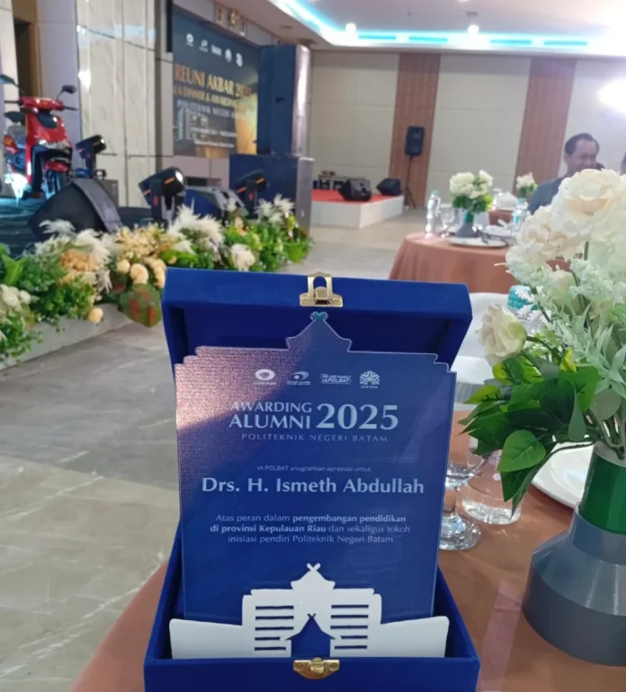 TERASBATAM.ID – Mantan Gubernur Kepulauan Riau (Kepri) pertama yang kini menjabat Anggota DPD RI, Drs. H. Ismeth Abdullah, menerima penghargaan khusus dari Ikatan Alumni Politeknik Negeri Batam (Polibatam). Penghargaan ini diberikan pada acara Reuni Akbar dan Awarding Night Alumni Polibatam Tahun 2025, Sabtu (22/11/2025), sebagai pengakuan atas perannya sebagai Tokoh Inisiasi Pendiri Politeknik Negeri Batam sekaligus kontribusinya dalam pengembangan pendidikan di Kepri.