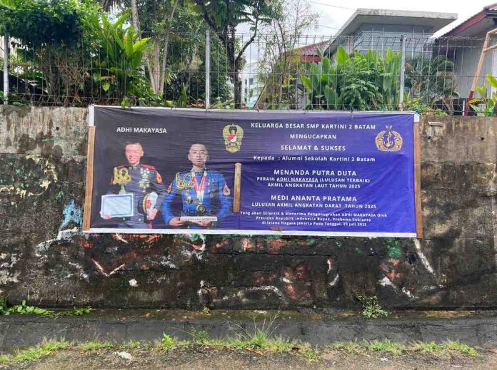 Sebuah baliho besar terpampang di area belakang Hotel Planet Holiday, tepatnya di persimpangan jalan menuju SMP Kartini 2 Batam, Kamis (4/9/2025). Baliho tersebut mengabarkan prestasi gemilang Menanda Putra Duta, lulusan terbaik Akmil Angkatan Laut, dan Medi Ananta Pratama, lulusan terbaik Akmil Angkatan Darat.