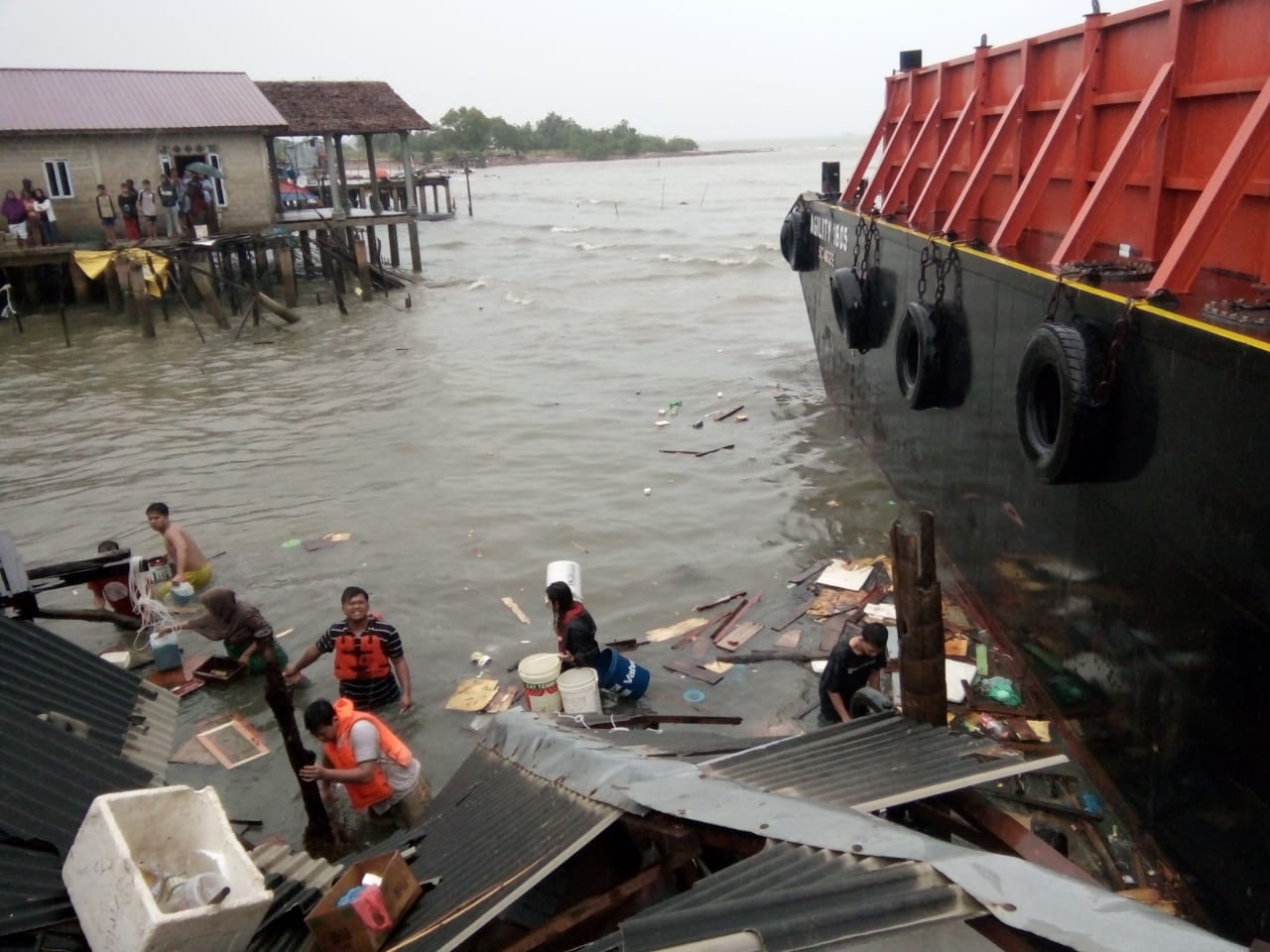 Dalam video amatir yang direkam oleh warga setempat terlihat kapal tongkang berukuran 853 GT tersebut hanyut dan perlahan terbawa arus mendekat ke pemukiman warga yang menyebabkan kepanikan. Warga terlihat menjerit dan berlarian menjauh saat kapal tongkang tersebut perlahan mendekat dan akhirnya menghantam pelantar dan rumah disana.