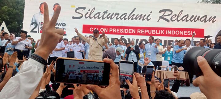 Saat Prabowo memberikan jeda pidato, terdengar teriakan “Prabowo Gemoy Presidenku.” Orasi ini disambut dengan gegap gempita dari para pendukungnya yang setia.