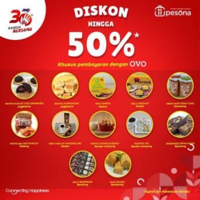Lebih dari 10 produk makanan dan oleh-oleh Indonesia unggulan Pesona seperti Skat Brownies, Bolu Meranti, Bika Ambon dan lainnya, dapat dipesan melalui www.pesonanusantara.co.id dengan mendapatkan potongan harga hingga 50% dengan maksimal diskon sebesar Rp 20.000,-. Promo diskon kali ini tak hanya pada saat Harbolnas saja, namun akan berlangsung selama 15 hari yaitu pada 12-26 Desember, serta promo ini hanya berlaku untuk pengguna OVO.