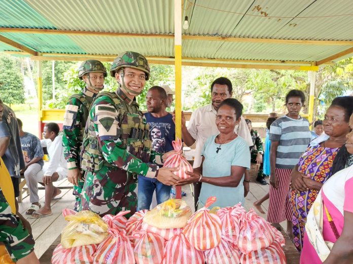 Dalam suasana yang penuh kekeluargaan, prajurit Marinir dan warga setempat melaksanakan doa bersama dan menikmati hidangan sederhana khas Papua. Warga dari kedua kampung tampak antusias mengikuti kegiatan yang diwarnai dengan tawa dan canda hangat.