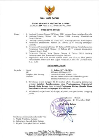 TERASBATAM.ID — Walikota Batam Amsakar Achmad resmi menunjuk Ir. Suhar, S.T., M.PWK., sebagai Pelaksana Harian (Plh) Kepala Dinas Perindustrian dan Perdagangan (Disperindag) Kota Batam. Penunjukan ini tertuang dalam Surat Perintah Pelaksana Harian Nomor: 651/100.3.5.3/BKPSDM/XII/2025 yang ditetapkan pada 30 Desember 2025.