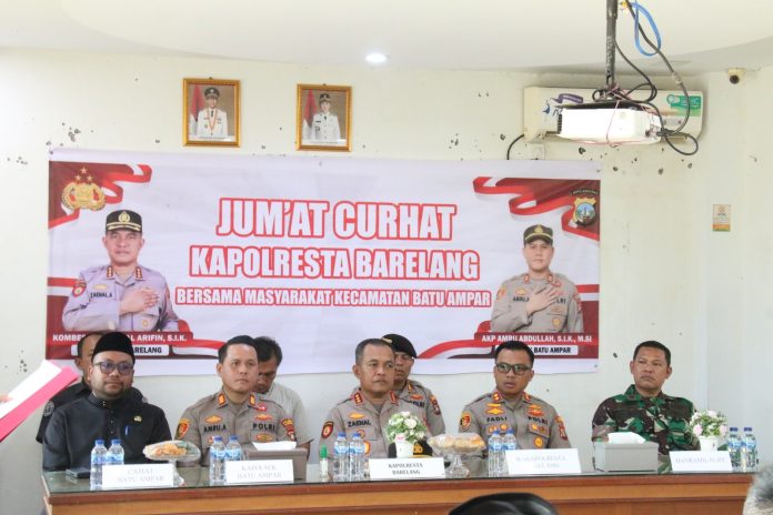 TERASBATAM.id – Kapolresta Barelang Kombes Pol Zaenal Arifin menggelar kegiatan Jumat Curhat bersama warga Kecamatan Batu Ampar, Kota Batam, pada Jumat (02/05/2025). Forum dialog yang berlangsung di Aula Kantor Camat Kelurahan Sei Jodoh ini menjadi wadah bagi masyarakat untuk menyampaikan langsung aspirasi dan keluhan terkait situasi keamanan dan ketertiban masyarakat (kamtibmas) di lingkungan mereka.