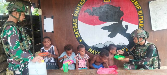 TERASBATAM.ID – Satuan Tugas Pengamanan Perbatasan (Satgas Pamtas) RI-PNG Mobile Yonif 10 Marinir/SBY “Gobang IV” menggelar kegiatan makan bersama yang penuh kehangatan dengan anak-anak setempat di Pos Ayata, Papua Barat Daya, pada Senin (25/08/2025).