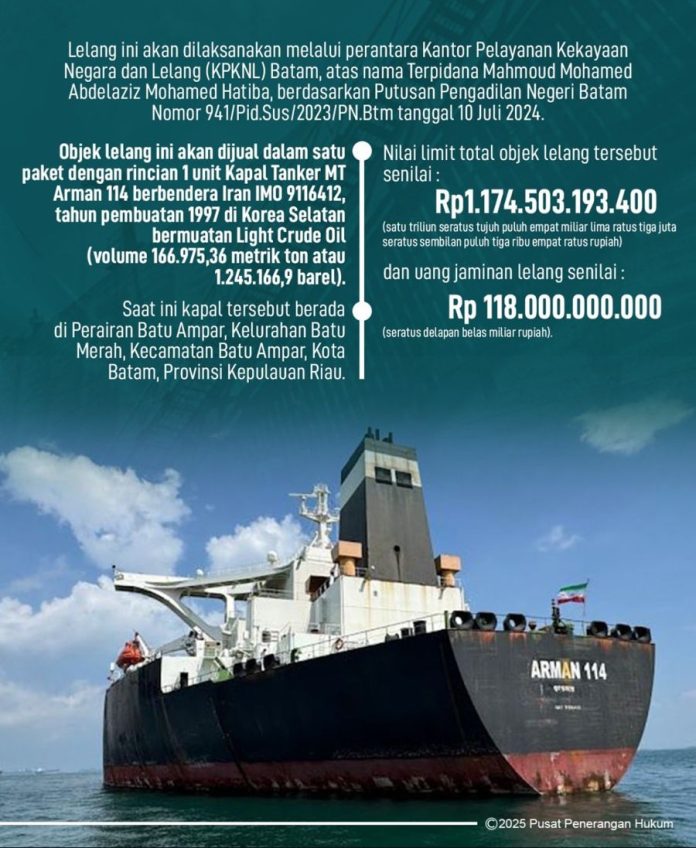 TERASBATAM.ID – Badan Pemulihan Aset Kejaksaan RI mengumumkan rencana pelaksanaan lelang barang rampasan negara berupa satu unit Kapal Tanker MT Arman 114 beserta muatan Light Crude Oil (minyak mentah ringan). Lelang aset rampasan ini, yang berpusat di Batam, menarik perhatian publik karena memiliki nilai limit yang mencapai lebih dari Rp 1,17 triliun.