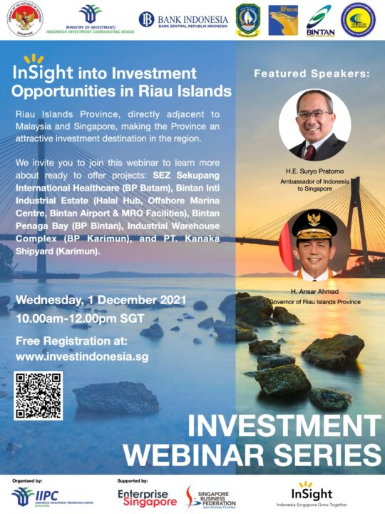 Webinar Series “Insight into investment opportunities” merupakan bagian dari rangkaian upaya mempromosikan peluang investasi di seluruh wilayah Indonesia yang sudah clean and clear dan ready to offer untuk ditawarkan kepada investor. Sepanjang tahun 2021, kegiatan webinar “Insight Into Opportunities In Riau Islands Province” ini adalah penyelenggaraan webinar yang ke – 11.