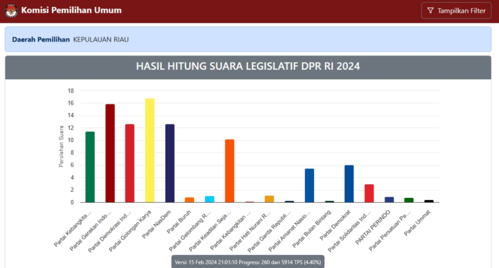 TERASBATAM.ID: Kisi-kisi Calon Anggota Legislatif untuk kursi Dewan Perwakilan Rakyat Republik Indonesia (DPR RI) dari Daerah Pemilihan Kepulauan Riau perlahan namun pasti mulai menunjukkan data yang terang, data terbaru dari Info Publik Pemilu 2024 (kpu.go.id), menunjukkan bahwa perolehan suara Partai Amanat Nasional (PAN) keluar dari 4 besar partai dengan perolehan suara terbanyak. Ini menunjukkan kursi DPR RI yang selama ini dipegang oleh PAN bakal melayang.