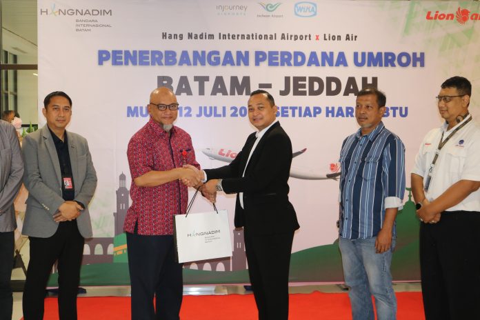 TERASBATAM.ID – Lion Air (JT082) bersama manajemen Bandara Internasional Batam (BIB) secara resmi meluncurkan penerbangan perdana umrah langsung dari Bandara Internasional Hang Nadim (BTH), Batam, menuju Bandar Udara Internasional King Abdulaziz (JED), Jeddah, Arab Saudi. Penerbangan bersejarah ini diberangkatkan pada Sabtu (12/07/2025), pukul 11.35 WIB, dan selanjutnya akan beroperasi setiap hari Sabtu.