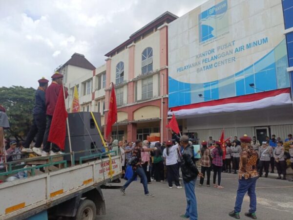 Aksi unjuk rasa digelar di Kantor Air Batam Hilir (ABH) yang berada di Ruko Komplek Batam Square Blok D No 2, Kelurahan Tering, Kecamatan Batam Kota, Kota Batam, Provinsi Kepulauan Riau (Kepri).