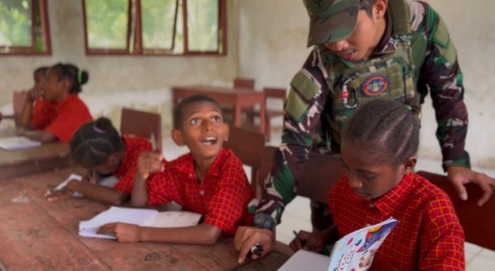TERASBATAM.ID – Satuan Tugas Pengamanan Perbatasan (Satgas Pamtas) RI-PNG Mobile Yonif 10 Marinir/Satria Bumi Yudha (SBY) yang bermarkas di Batam, Kepulauan Riau kini menjadi tumpuan di dunia pendidikan wilayah pedalaman Papua Barat Daya. Personel teritorial Satgas Marinir membantu proses belajar mengajar bagi siswa-siswi SD YPK Ebenhezer Fuog di Distrik Aifat, Kabupaten Maybrat, Rabu (1/10/2025).
