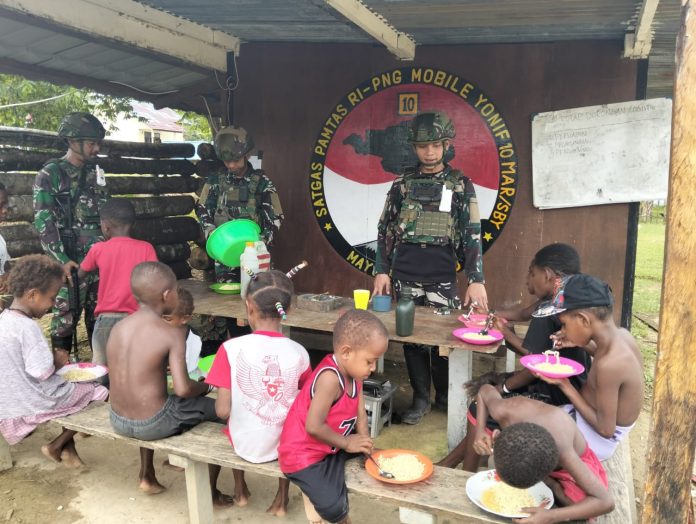 TERASBATAM.ID – Satuan Tugas Pengamanan Perbatasan (Satgas Pamtas) RI-PNG Mobile Batalyon Infanteri 10 Marinir/SBY menggelar acara makan bersama dengan anak-anak dari Kampung Ayata di sekitar pos mereka. Kegiatan ini merupakan upaya untuk mempererat hubungan dan menumbuhkan kebersamaan dengan masyarakat setempat.