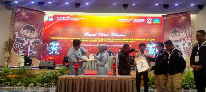 TERASBATAM.ID: Komisi Pemilihan Umum (KPU) Kabupaten Bintan resmi menetapkan pasangan calon untuk Pilkada Bintan 2024 dalam rapat pleno terbuka di Hotel Bintan Agro Beach Resort, Gunung Kijang, pada Senin (23/9/2024). Dalam pleno tersebut, pasangan inkumben Roby Kurniawan-Deby Maryanti mendapatkan nomor urut 1, sementara nomor urut 2 diberikan kepada kotak kosong.