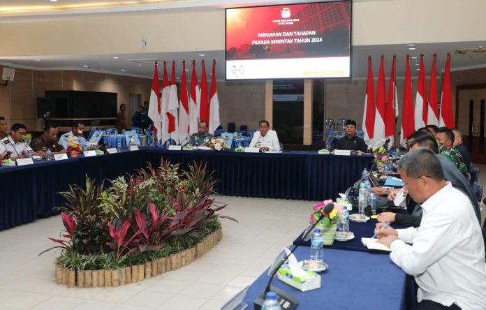 TERASBATAM.id: Pjs Wali Kota Batam, Andi Agung, mengadakan rapat koordinasi dengan Forum Komunikasi Pimpinan Daerah (Forkompida) Kota Batam untuk membahas persiapan Pemilihan Kepala Daerah (Pilkada) Wali Kota dan Wakil Wali Kota Batam serta Pemilihan Gubernur dan Wakil Gubernur Kepulauan Riau (Kepri) yang akan digelar pada 27 November 2024. Rapat berlangsung pada Selasa, 12 November 2024 lalu, di Lantai 4 Gedung Pemerintah Kota Batam, Batam Center.