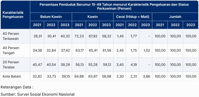 Pada tahun 2021, sebesar 26,31 persen penduduk belum menikah di Batam berada di kelompok 40 persen terbawah. Angka ini melonjak menjadi 40,32 persen di tahun 2023. Tren serupa juga terjadi pada penduduk yang sudah menikah, di mana persentasenya naik dari 72,23 persen menjadi 78,32 persen dalam periode yang sama.
