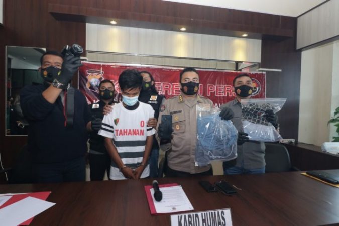 Dari kejahatan yang dilakukan oleh tersangka ini berhasil diamankan juga barang bukti 1 unit Handphone yang digunakan tersangka untuk Chating dengan para korbannya, 1 buah Kamera, 1 helai baju warna abu-abu, 1 helai celana panjang warna biru, 1 helai celana dalam warna ungu, 1 helai Bra warna hitam, 1 helai baju warna hitam motif kotak-kotak dan 1 helai celana panjang warna biru.