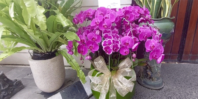 Anggrek cantik berwarna ungu itu diletakkan dalam pot berwarna hijau gelap yang dihiasi pita emas. Kado tersebut diterima oleh ajudan Presiden Jokowi, Kompol Syarif Muhammad Fitriansyah, dan kemudian dipajang di bagian depan rumah.
