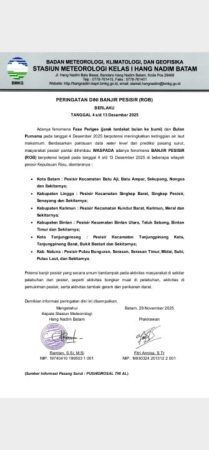 TERASBATAM.ID — Badan Meteorologi, Klimatologi, dan Geofisika (BMKG) Stasiun Meteorologi Kelas I Hang Nadim Batam mengeluarkan peringatan dini terkait potensi banjir rob yang akan melanda sejumlah wilayah pesisir di Kepulauan Riau (Kepri). Peringatan ini berlaku mulai 4 hingga 13 Desember 2025.