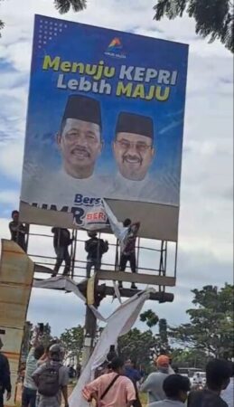 Baliho dengan photo Walikota Batam Muhammad Rudi dan Bupati Karimun Aunur Rofiq dengan tulisan “Menuju Kepri Lebih Maju” dirusak oleh sejumlah warga yang menaiki tiang kemudian menyobek baliho ukuran jumbo itu.