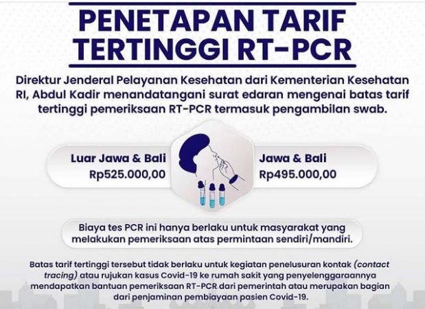 Keputusan ini berdasarkan Surat Edaran Dirjen Pelayanan Kesehatan Nomor HK.02.02/I/2845/2021 tentang Batas Tarif Tertinggi Pemeriksaan RT-PCR.