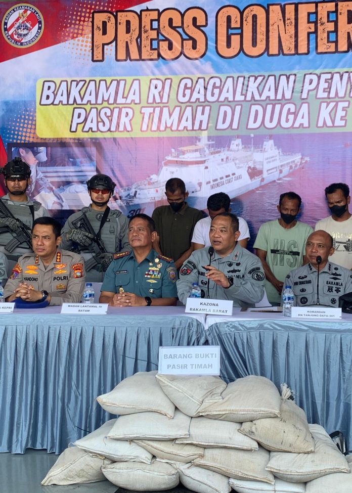 Badan Keamanan Laut (Bakamla) RI melalui KN. Tanjung Datu-301 berhasil mengamankan KM Doa Restu Ibu Jaya yang mengangkut 600 karung pasir timah dengan total berat 30 ton di perairan Lingga, Kepulauan Riau, pada Jumat (25/4/2025) sekitar pukul 10.00 WIB. Kepala Zona Barat Bakamla, Laksamana Pertama TNI Bambang Trijanto, menjelaskan bahwa penangkapan berawal dari kecurigaan personel patroli KN Tanjung Datu – 301 terhadap sebuah kapal yang melintas.