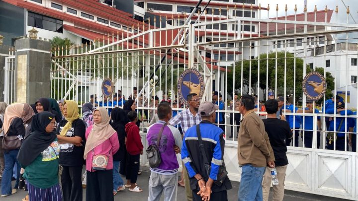 Di luar gerbang, sambil membentangkan spanduk berisi penolakan, warga menyuarakan protes terhadap proyek strategis nasional (PSN) Rempang Eco City. Mereka juga menolak skema transmigrasi lokal yang dinilai sebagai bentuk penggusuran terselubung.