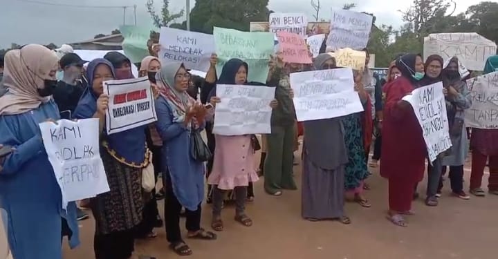 TERASBATAM.ID: Sejumlah warga Sembulang Hulu dan masyarakat Sembulang Hulu di Pulau Rempang menggelar aksi menolak relokasi saat Badan Pengusahaan (BP) Batam yang terkesan ngotot mengadakan peletakan batu pertama atau Groundbreaking pembangunan 4 unit contoh rumah relokasi di Tanjung Banon, Rabu (10/01/2024).
