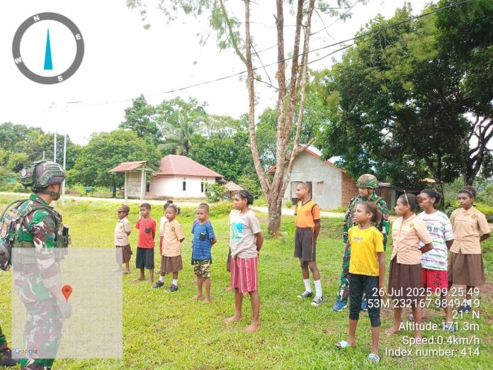 TERASBATAM.ID – Satuan Tugas Pengamanan Perbatasan (Satgas Pamtas) RI-PNG Mobile Gobang IV Yonif 10 Marinir/SBY secara rutin memberikan materi Peraturan Baris Berbaris (PBB) dan tata cara upacara bendera kepada siswa-siswa SD Inpres Tashimara, Kampung Faankahrio. Kegiatan ini dilaksanakan setiap hari Sabtu dan bertujuan membentuk karakter disiplin serta menanamkan semangat nasionalisme sejak dini.