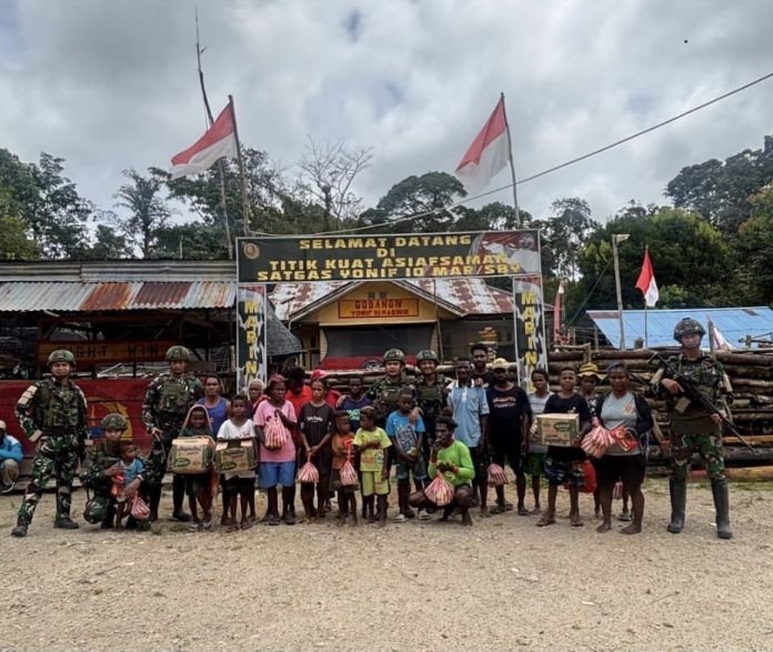 TERASBATAM.ID – Prajurit Satuan Tugas Pengamanan Perbatasan (Satgas Pamtas) RI-PNG Mobile Yonif 10 Marinir/SBY membagikan bantuan sembako kepada warga di Kampung Asiafsaman, Distrik Aifat, Minggu (14/09/2025). Kedatangan prajurit TNI AL ini disambut senyum dan ucapan syukur dari masyarakat.